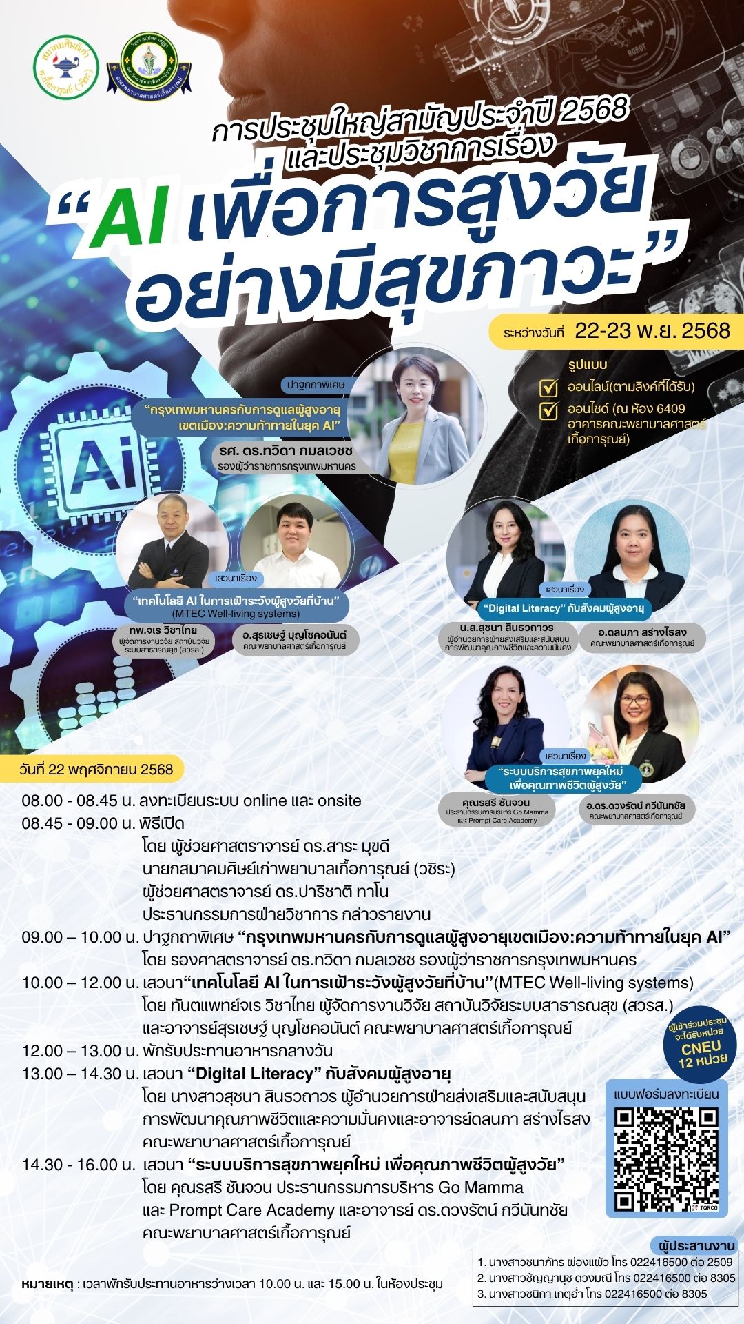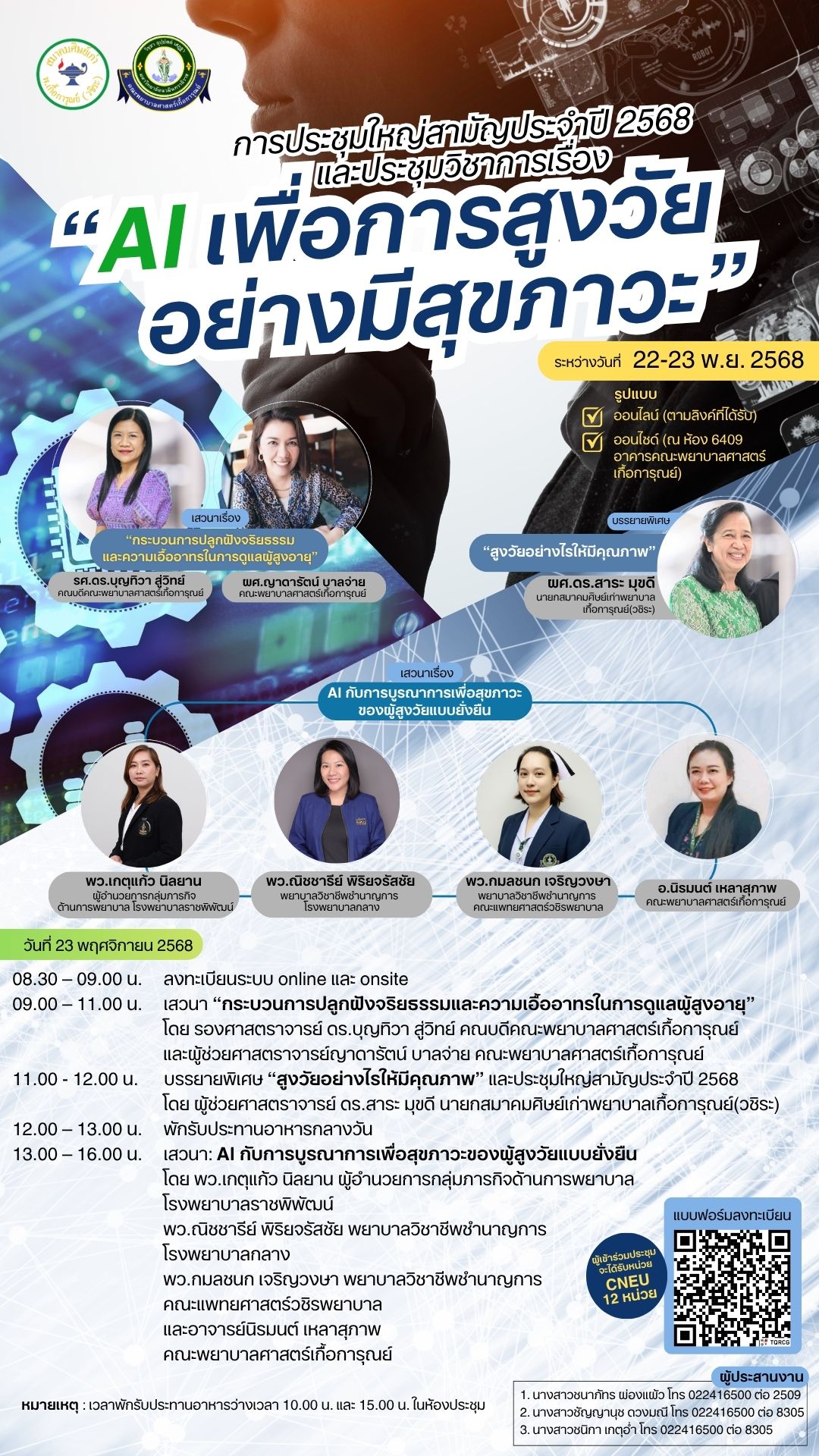 ขอเชิญผู้สนใจลงทะเบียนอบรมโครงการประชุมวิชาการ AI เพื่อการสูงวัยอย่างมีสุขภาวะ จัดโดยสมาคมศิษย์เก่าพยาบาลเกื้อการุณย์ (วชิระ) ร่วมกับคณะพยาบาลศาสตร์เกื้อการุณย์