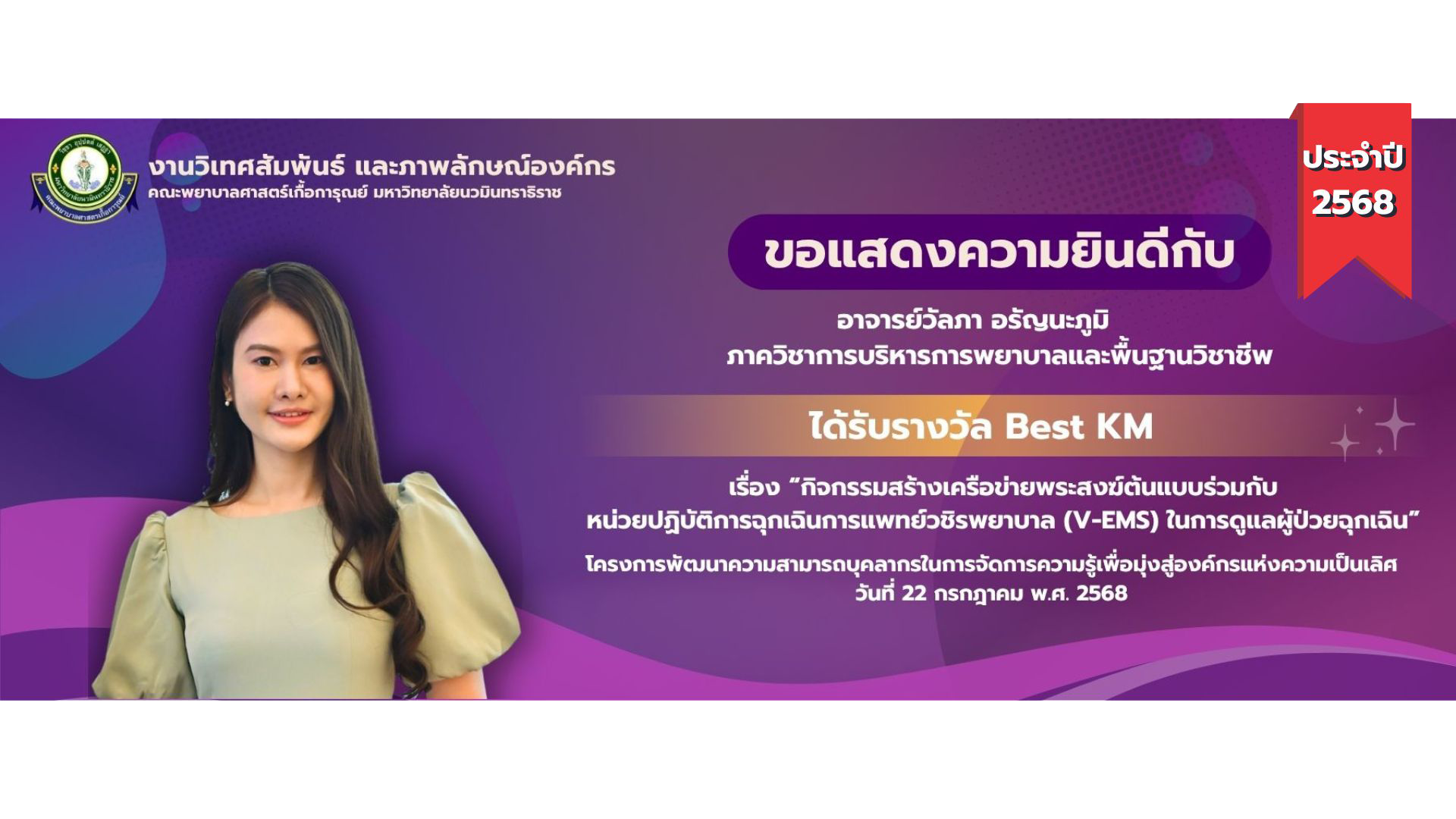 รางวัล Best KM เรื่อง กิจกรรมสร้างเครือข่ายพระสงฆ์ต้นแบบร่วมกับหน่วยปฏิบัติการฉุกเฉินการแพทย์วชิรพยาบาล (V-EMS) ในการดูแลผู้ป่วยฉุกเฉิน