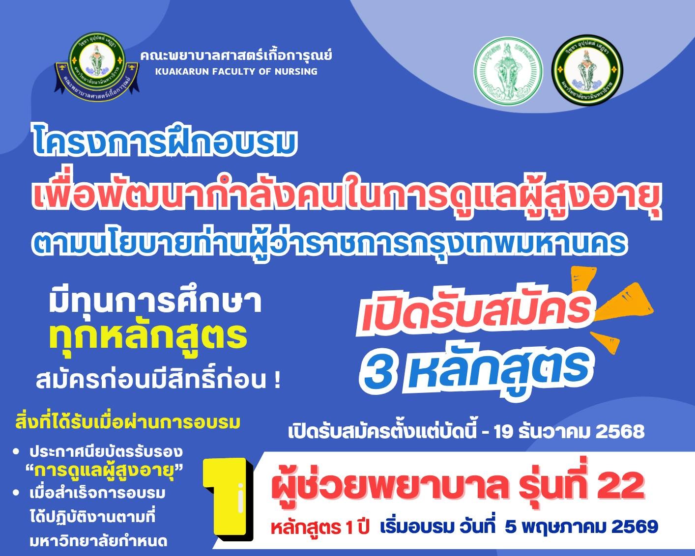 ประชาสัมพันธ์เปิดรับสมัคร โครงการฝึกอบรมเพื่อพัฒนากำลังคนในการดูแลผู้สูงอายุ ตามนโยบายท่านผู้ว่าราชการกรุงเทพมหานคร จำนวน 3 หลักสูตร