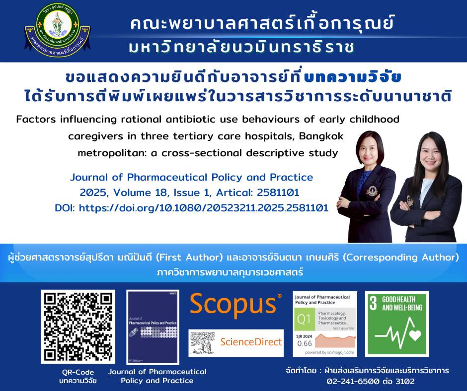 ขอแสดงความยินดีกับคณาจารย์คณะพยาบาลศาสตร์เกื้อการุณย์ ผู้ช่วยศาสตราจารย์สุปรีดา มณิปันตี และอาจารย์จินตนา เกษมศิริ ได้รับตีพิมพ์บทความวิจัยในฐานข้อมูล Scopus ระดับคุณภาพวารสาร Q1